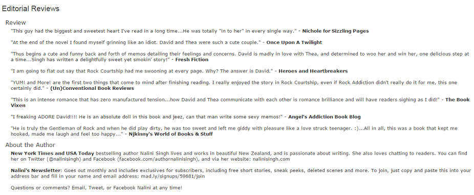 5) I was pleasantly surprised to see that popular Romance Writer, Nalini Singh has quoted my Review of her latest Bestselling Release, Rock Redemption (Rock Kiss Series, Book 3) on Amazon in the Editorial Review section. How Cool! I am feeling so very proud to see my review out there and happy that my reviews help the authors. 🙂